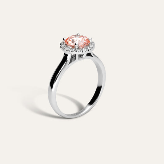 Classic round engagement ring with halo in fancy pink (1.50 ct)